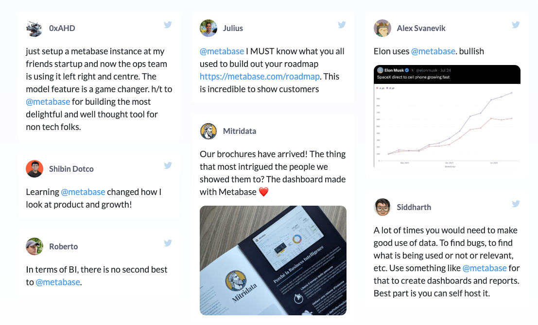 案例研究:Cal.com使用Metabase分析日程数据,赞扬其开源特性。其他用户报告在金融和营销中更快决策。